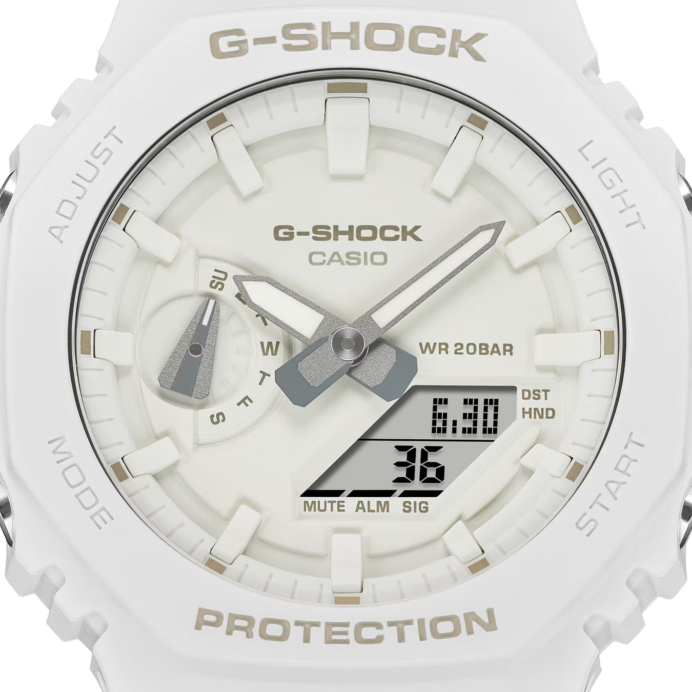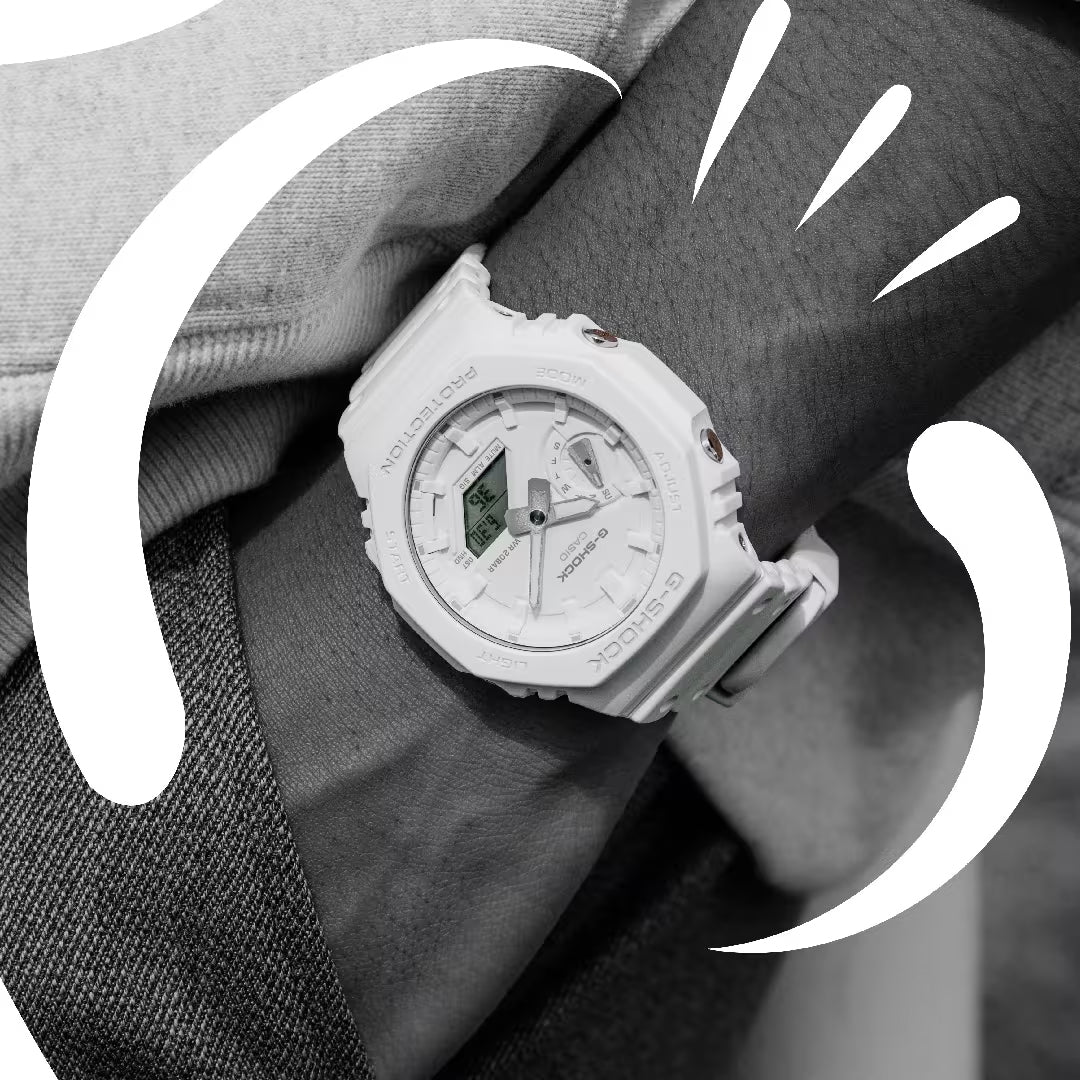 El GA-2100 luce su forma icónica en un estilo monocromático, disponible en tres colores: azul turquesa, blanco y amarillo voltio. La caja, el bisel e incluso los componentes de la esfera están acabados en tonos del mismo color sutilmente diferentes para aportarle un aspecto monocromático que cuenta con una profundidad y dimensión sorprendentes.