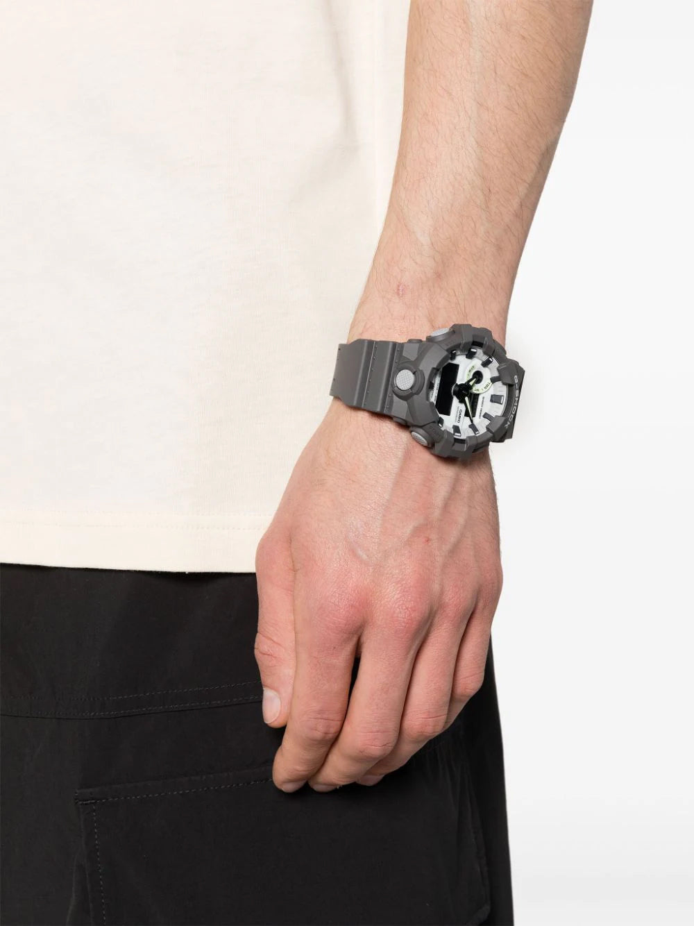 Libera todo tu potencial y muestra lo oculto. Presentamos el G-SHOCK que brilla en la oscuridad. Esta gama cuenta con partes luminiscentes sobre una base gris oscura, un diseño inspirado en los talentos ocultos que todos tenemos, pero rara vez mostramos. Empezamos con una base de gris para evocar la oscuridad y, luego, añadimos componentes luminiscentes y detalles en blanco a la esfera, para crear un reloj monocromático con un brillo muy especial. Busca un lugar oscuro y comprueba cómo este atrevido diseño cobra vida con un resplandeciente brillo.