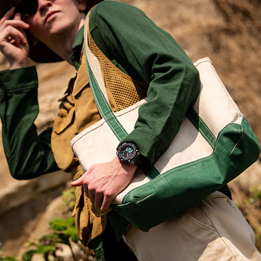 Responda el llamado a cada aventura con este resistente reloj creado con una estructura de protección central de carbono: la parte posterior de la carcasa y los botones para proporcionar una carcasa delgada de tan solo 12,4 mm. Los botones laterales más grandes resistentes a los golpes eliminan la necesidad de usar protectores de botones a fin de ofrecer un reloj más compacto. El bisel redondo con seis detalles de tornillos proyecta la resistencia que exigen las aventuras grandes y pequeñas. Las piezas y el dial se elaboran por separado y, luego, se ensamblan para agregar dimensionalidad dinámica a la imagen del reloj. La pantalla digital funciona en diagonal entre las posiciones de las 4 y las 6 para brindar un toque final de audacia rotunda.