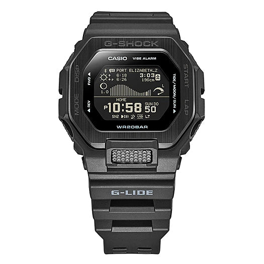 Disfruta del surf con G-lide GBX-100 de G-shock, conectado a smartphone para acceder a datos de mareas y condiciones de luz. Pantalla LCD MIP brillante muestra gráficos de mareas, fase lunar y horarios de mareas y sol. Resistente a golpes y diseñado para aventuras en el mar.